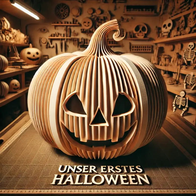 Am nächsten Tag sah Grimmo weiter zu, wie die Werkstatt, erfüllt von Halloween-Geist, in vollem Gange war. Immer mehr Dekorationen verließen die Regale, und jede von ihnen hatte eine besondere Note, die sie einzigartig machte. Grimmo beobachtete, wie ein großer lasergravierter Kürbis auf die Gravurmaschine gestellt wurde. Der Kunde hatte gewünscht, dass der Familienname und der Text „Unser erstes Halloween“ auf den Kürbis graviert wurden. Der Gravurprozess war so fein und detailreich, dass es wie ein Kunstwerk aussah.