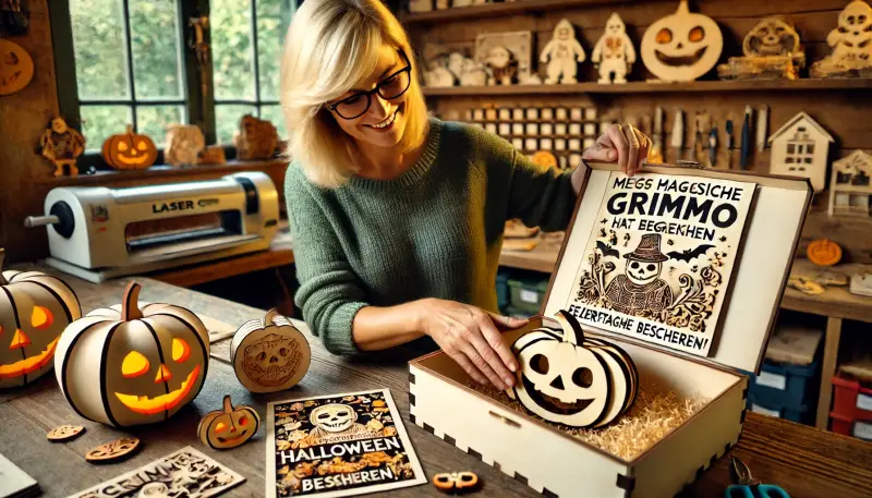 Die Meisterin, die immer präzise und mit viel Liebe zum Detail arbeitete, überprüfte jedes kleinste Detail. Mit besonderer Sorgfalt bereitete sie alles vor, um eine besondere Botschaft auf Grimmo zu gravieren. Es war keine gewöhnliche Gravur – auf seiner Seite wurde der Familienname zusammen mit einem kleinen Halloween-Kürbis und flatternden Fledermäusen eingraviert. Das machte Grimmo zu einem besonderen und einzigartigen Schatz.
